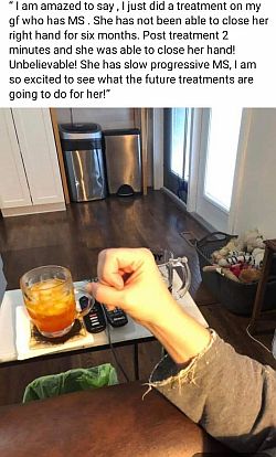 Above the image reads: "I am amazed to say, I just did a treatment on my gf who has MS. She has not been able to close her right hand for six months. Post treatment 2 minutes and she was able to close her hand! Unbelievable! She has slow, progressive MS. I am so excited to see what the future treatments are going to do for her!"